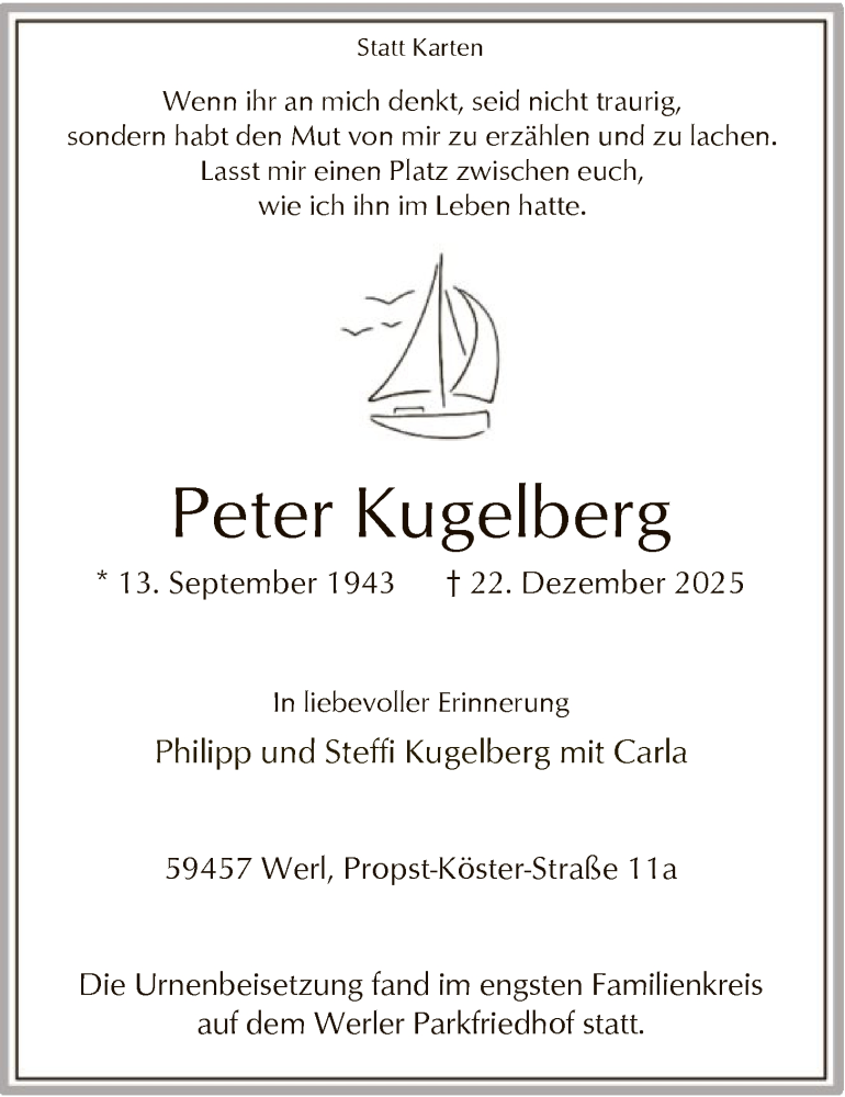 Hier finden Sie alle Traueranzeigen aus der Zeitung, die bisher für Peter Kugelberg erschienen sind. Weitere Traueranzeigen, die in der Zeitung erscheinen, werden hier ebenfalls aufgelistet