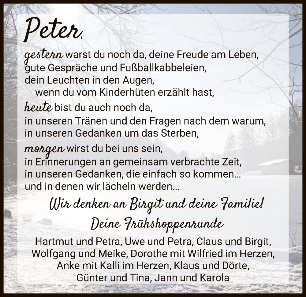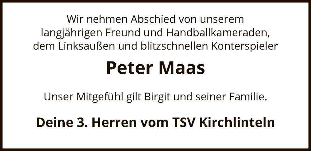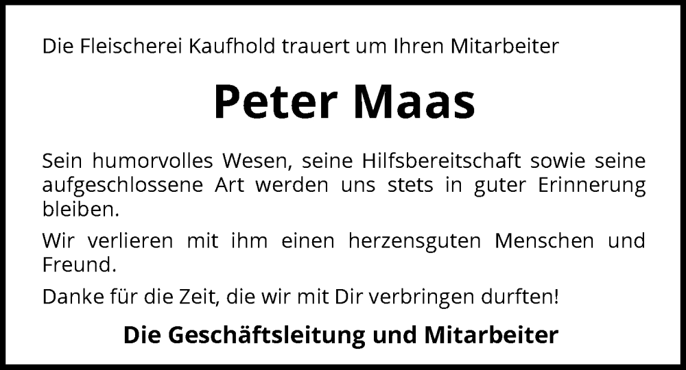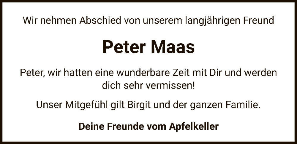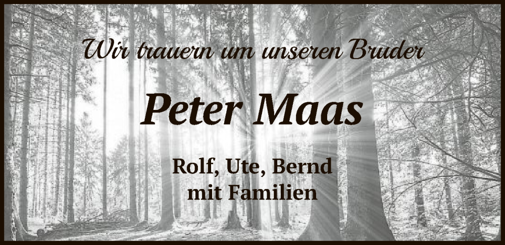 Hier finden Sie alle Traueranzeigen aus der Zeitung, die bisher für Peter Maas erschienen sind. Weitere Traueranzeigen, die in der Zeitung erscheinen, werden hier ebenfalls aufgelistet