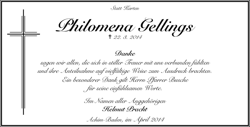 Hier finden Sie alle Traueranzeigen aus der Zeitung, die bisher für Philomena Gellings erschienen sind. Weitere Traueranzeigen, die in der Zeitung erscheinen, werden hier ebenfalls aufgelistet
