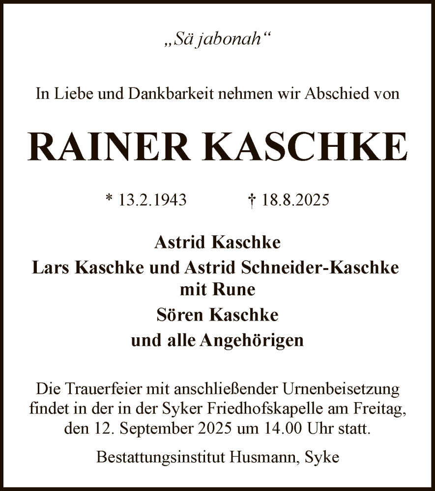 Hier finden Sie alle Traueranzeigen aus der Zeitung, die bisher für Rainer Kaschke erschienen sind. Weitere Traueranzeigen, die in der Zeitung erscheinen, werden hier ebenfalls aufgelistet