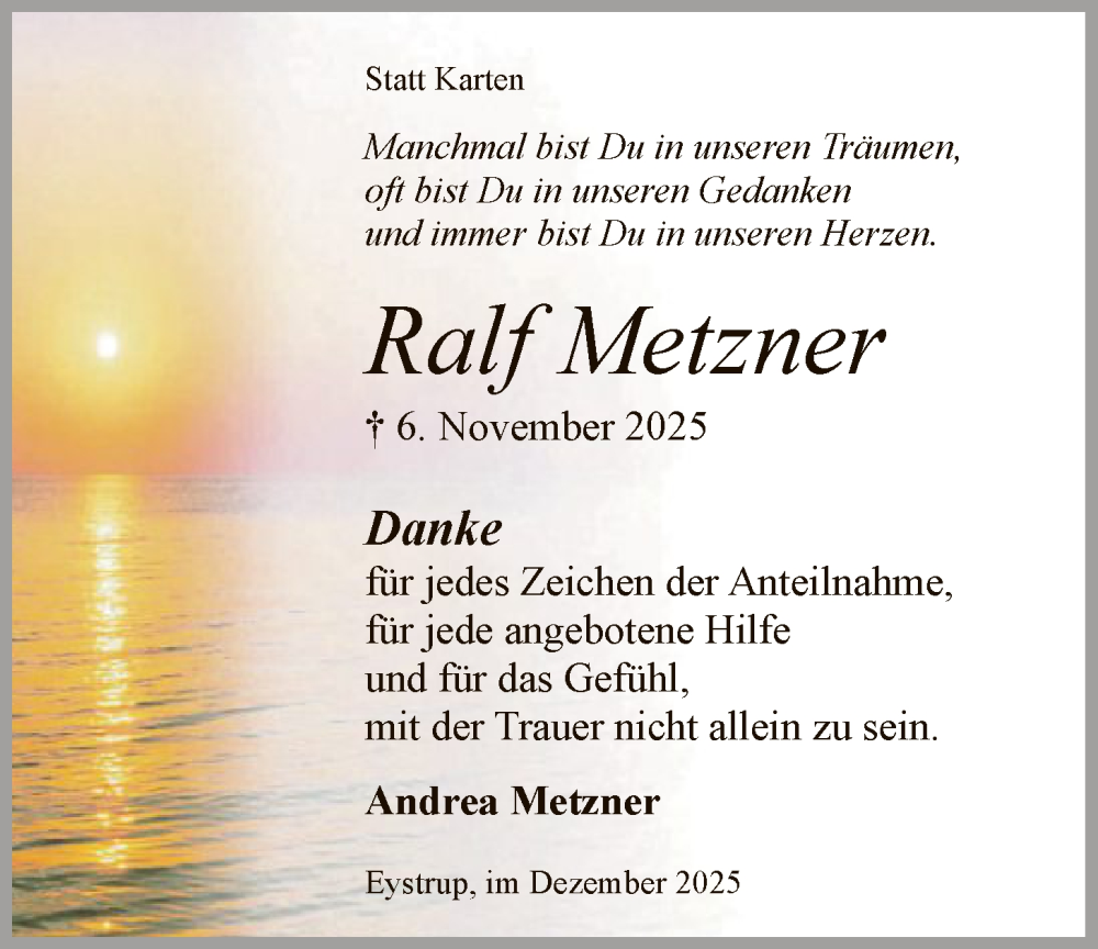 Hier finden Sie alle Traueranzeigen aus der Zeitung, die bisher für Ralf Metzner erschienen sind. Weitere Traueranzeigen, die in der Zeitung erscheinen, werden hier ebenfalls aufgelistet