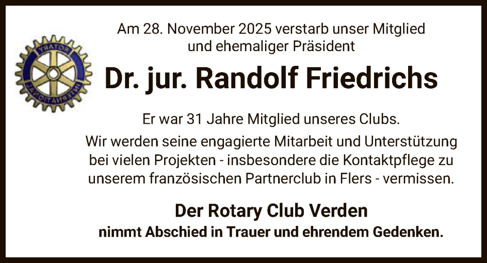 Hier finden Sie alle Traueranzeigen aus der Zeitung, die bisher für Randolf Friedrichs erschienen sind. Weitere Traueranzeigen, die in der Zeitung erscheinen, werden hier ebenfalls aufgelistet