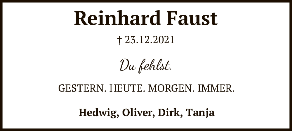 Hier finden Sie alle Traueranzeigen aus der Zeitung, die bisher für Reinhard Faust erschienen sind. Weitere Traueranzeigen, die in der Zeitung erscheinen, werden hier ebenfalls aufgelistet
