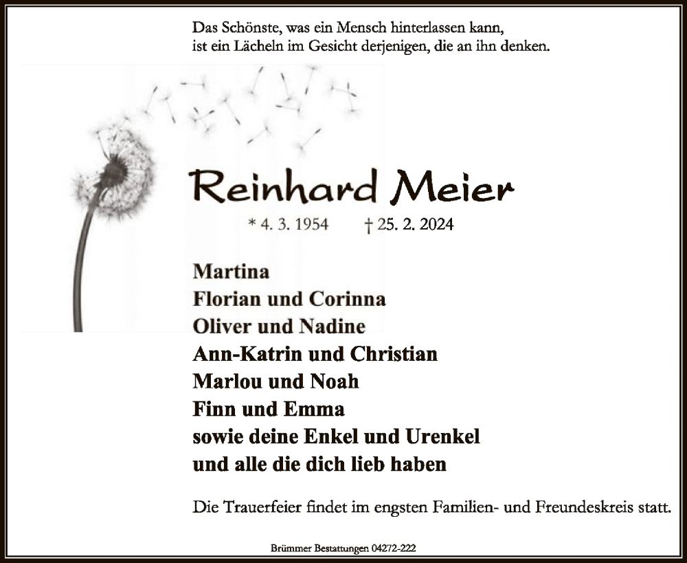 Hier finden Sie alle Traueranzeigen aus der Zeitung, die bisher für Reinhard Meier erschienen sind. Weitere Traueranzeigen, die in der Zeitung erscheinen, werden hier ebenfalls aufgelistet