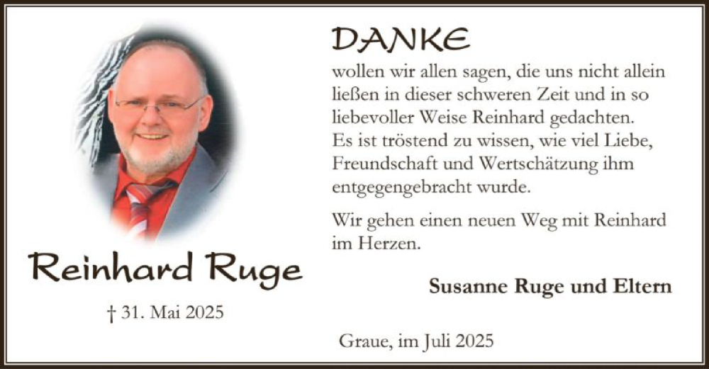 Hier finden Sie alle Traueranzeigen aus der Zeitung, die bisher für Reinhard Ruge erschienen sind. Weitere Traueranzeigen, die in der Zeitung erscheinen, werden hier ebenfalls aufgelistet