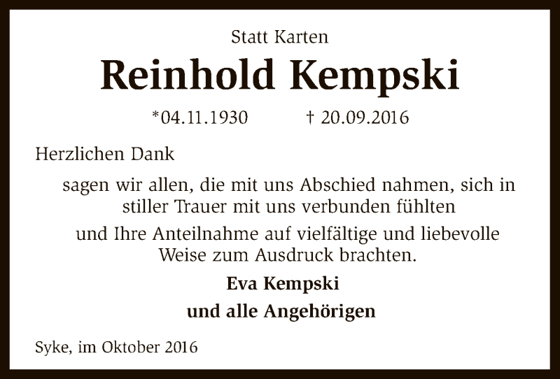 Hier finden Sie alle Traueranzeigen aus der Zeitung, die bisher für Reinhold Kempski erschienen sind. Weitere Traueranzeigen, die in der Zeitung erscheinen, werden hier ebenfalls aufgelistet