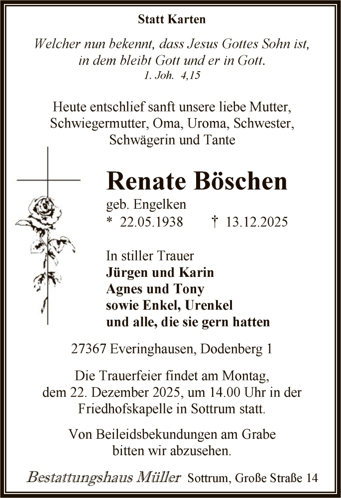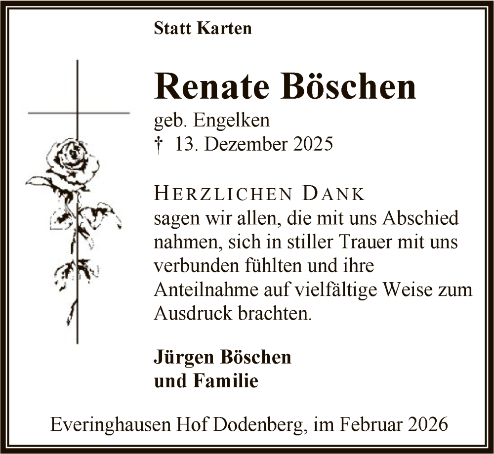 Hier finden Sie alle Traueranzeigen aus der Zeitung, die bisher für Renate Böschen erschienen sind. Weitere Traueranzeigen, die in der Zeitung erscheinen, werden hier ebenfalls aufgelistet