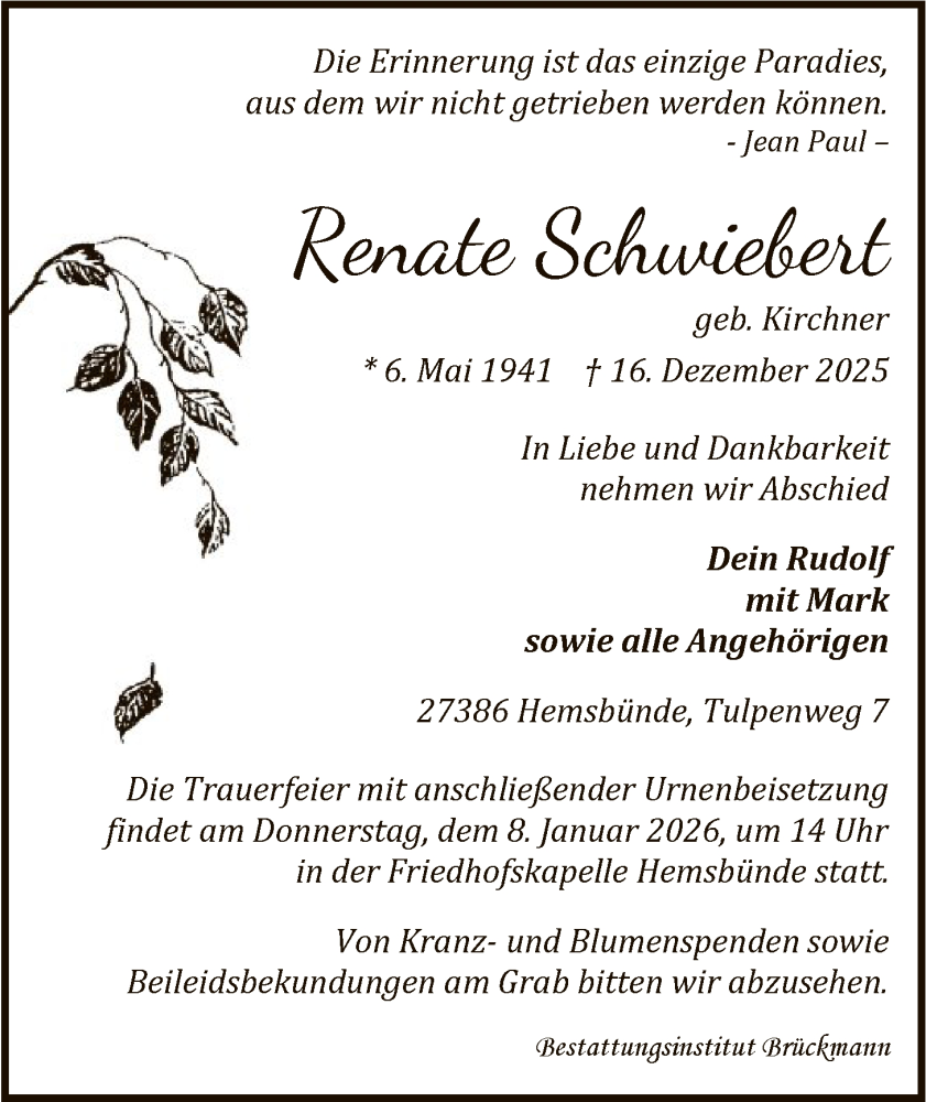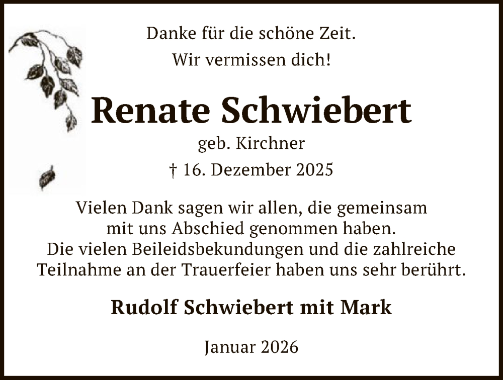 Hier finden Sie alle Traueranzeigen aus der Zeitung, die bisher für Renate Schwiebert erschienen sind. Weitere Traueranzeigen, die in der Zeitung erscheinen, werden hier ebenfalls aufgelistet