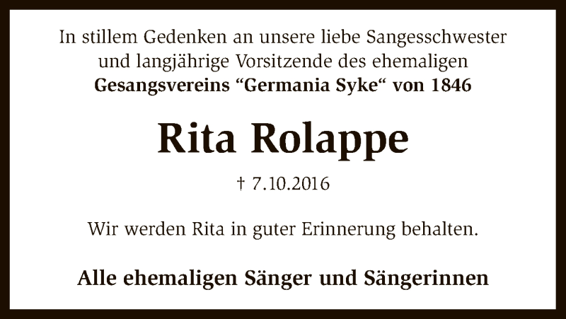 Hier finden Sie alle Traueranzeigen aus der Zeitung, die bisher für Rita Rolappe erschienen sind. Weitere Traueranzeigen, die in der Zeitung erscheinen, werden hier ebenfalls aufgelistet