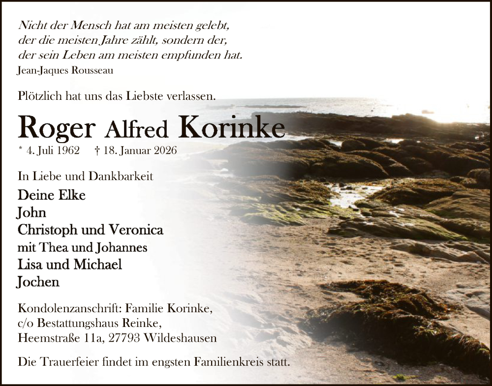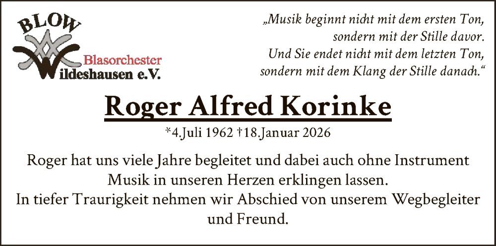 Hier finden Sie alle Traueranzeigen aus der Zeitung, die bisher für Roger Alfred Korinke erschienen sind. Weitere Traueranzeigen, die in der Zeitung erscheinen, werden hier ebenfalls aufgelistet