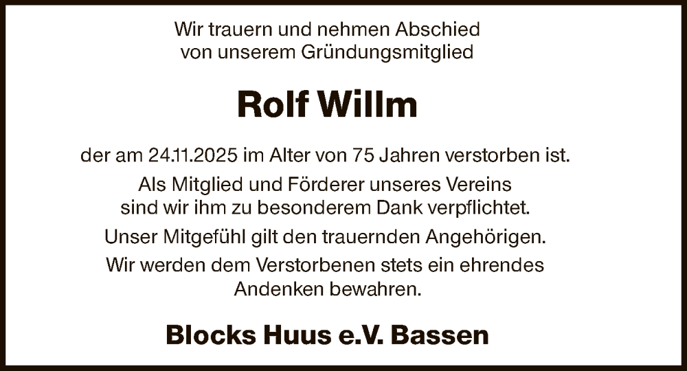 Hier finden Sie alle Traueranzeigen aus der Zeitung, die bisher für Rolf Willm erschienen sind. Weitere Traueranzeigen, die in der Zeitung erscheinen, werden hier ebenfalls aufgelistet