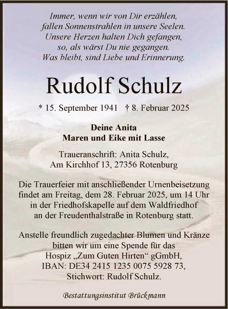 Hier finden Sie alle Traueranzeigen aus der Zeitung, die bisher für Rudolf Schulz erschienen sind. Weitere Traueranzeigen, die in der Zeitung erscheinen, werden hier ebenfalls aufgelistet