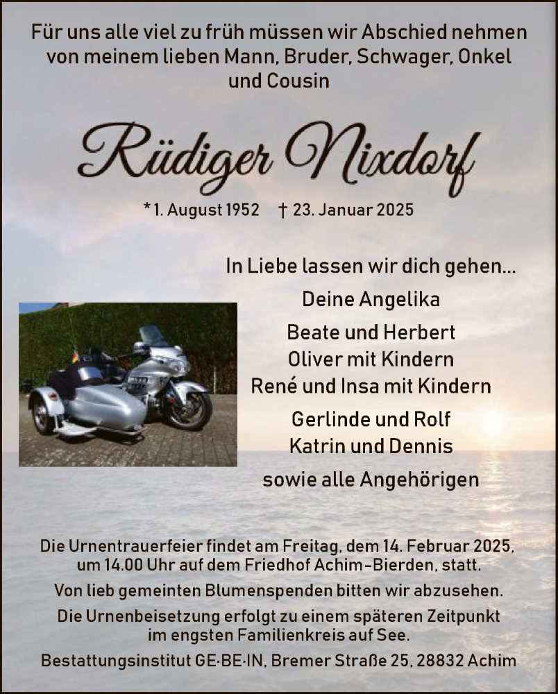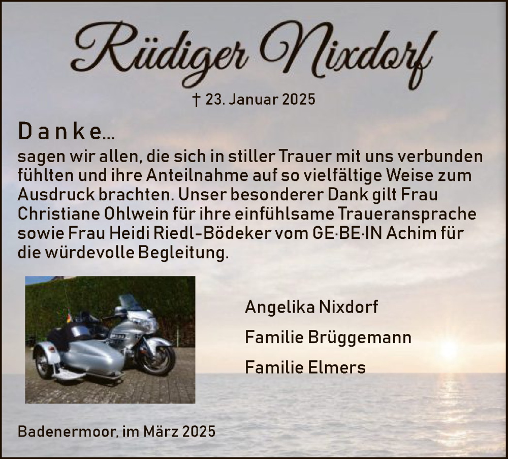 Hier finden Sie alle Traueranzeigen aus der Zeitung, die bisher für Rüdiger Nixdorf erschienen sind. Weitere Traueranzeigen, die in der Zeitung erscheinen, werden hier ebenfalls aufgelistet