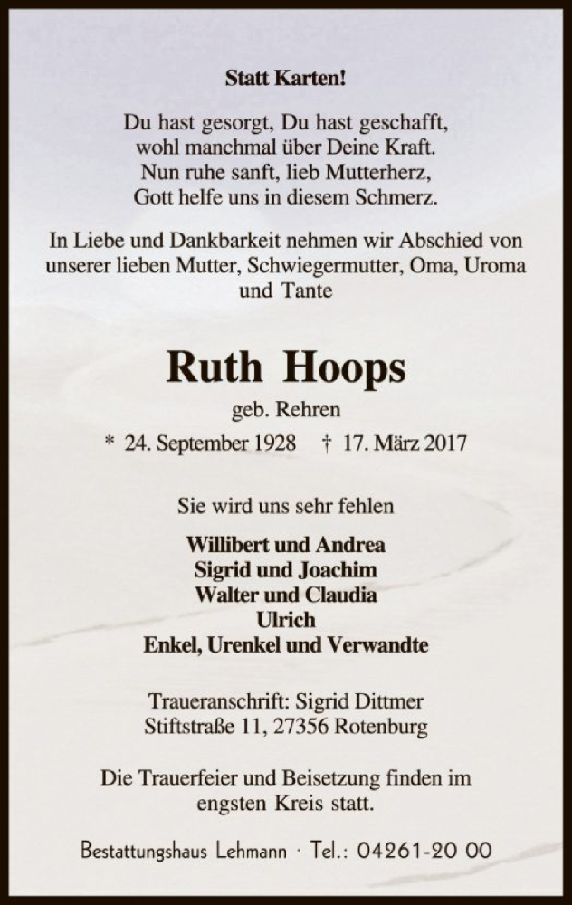 Hier finden Sie alle Traueranzeigen aus der Zeitung, die bisher für Ruth Hoops erschienen sind. Weitere Traueranzeigen, die in der Zeitung erscheinen, werden hier ebenfalls aufgelistet