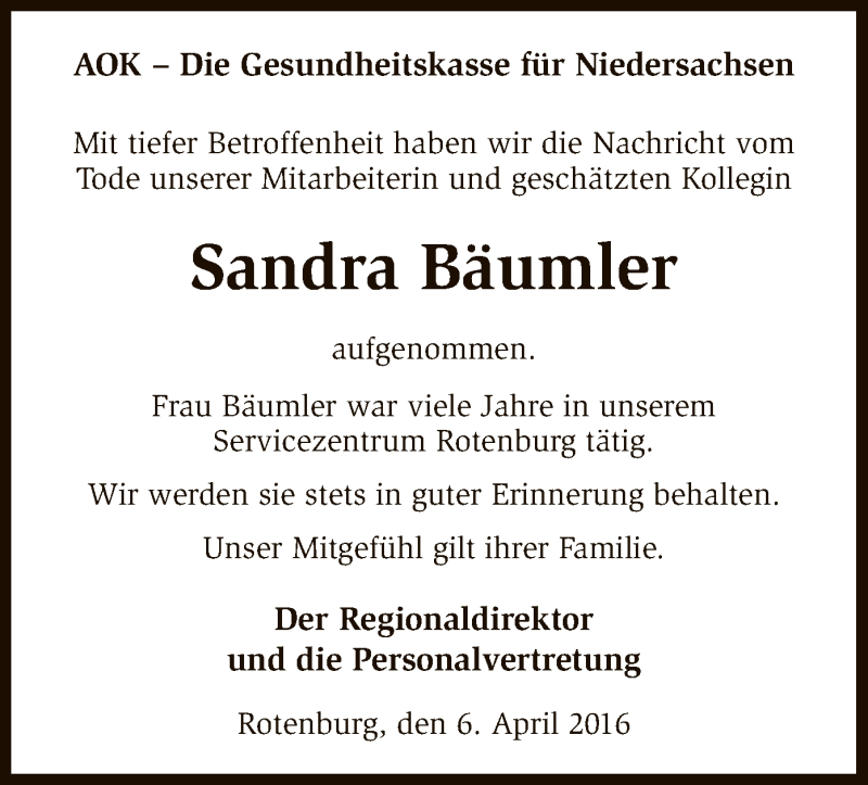 Hier finden Sie alle Traueranzeigen aus der Zeitung, die bisher für Sandra Bäumler erschienen sind. Weitere Traueranzeigen, die in der Zeitung erscheinen, werden hier ebenfalls aufgelistet