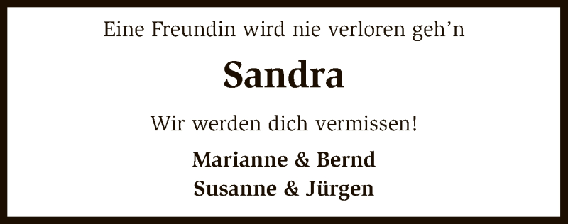 Hier finden Sie alle Traueranzeigen aus der Zeitung, die bisher für Sandra Meyer erschienen sind. Weitere Traueranzeigen, die in der Zeitung erscheinen, werden hier ebenfalls aufgelistet
