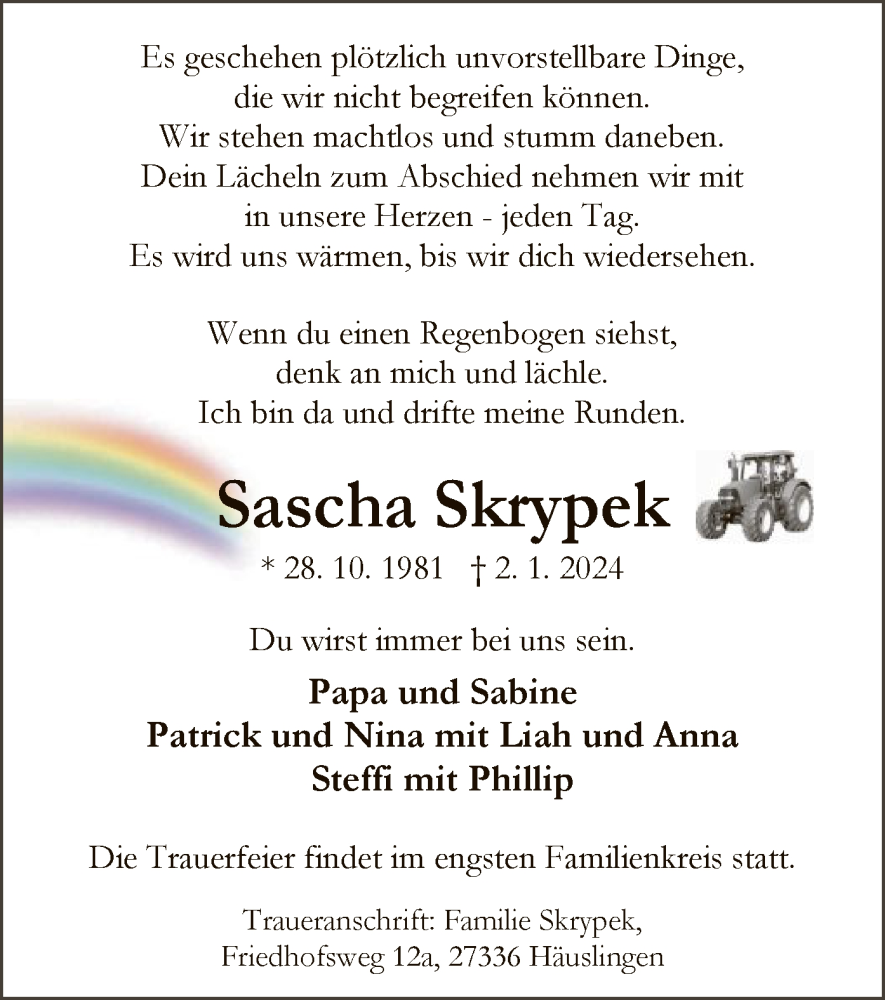 Hier finden Sie alle Traueranzeigen aus der Zeitung, die bisher für Sascha Skrypek erschienen sind. Weitere Traueranzeigen, die in der Zeitung erscheinen, werden hier ebenfalls aufgelistet