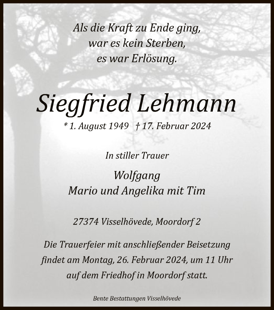 Hier finden Sie alle Traueranzeigen aus der Zeitung, die bisher für Siegfried Lehmann erschienen sind. Weitere Traueranzeigen, die in der Zeitung erscheinen, werden hier ebenfalls aufgelistet