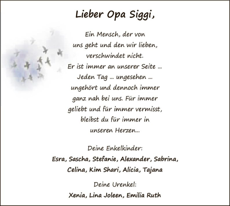 Hier finden Sie alle Traueranzeigen aus der Zeitung, die bisher für Siggi erschienen sind. Weitere Traueranzeigen, die in der Zeitung erscheinen, werden hier ebenfalls aufgelistet