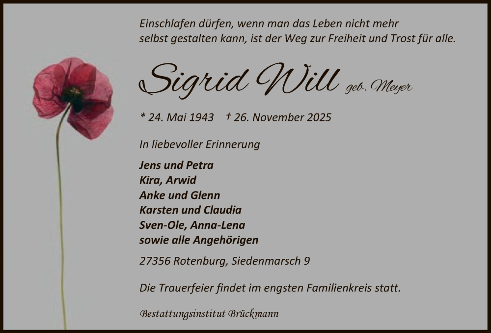 Hier finden Sie alle Traueranzeigen aus der Zeitung, die bisher für Sigrid Will erschienen sind. Weitere Traueranzeigen, die in der Zeitung erscheinen, werden hier ebenfalls aufgelistet