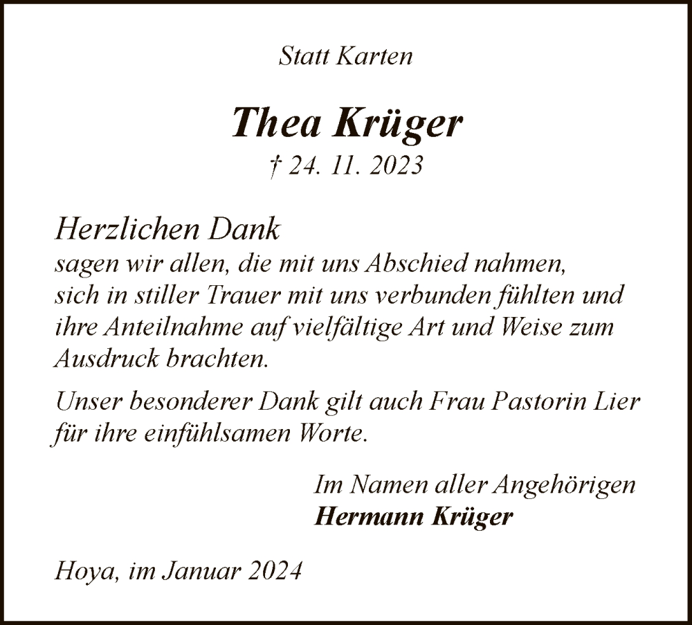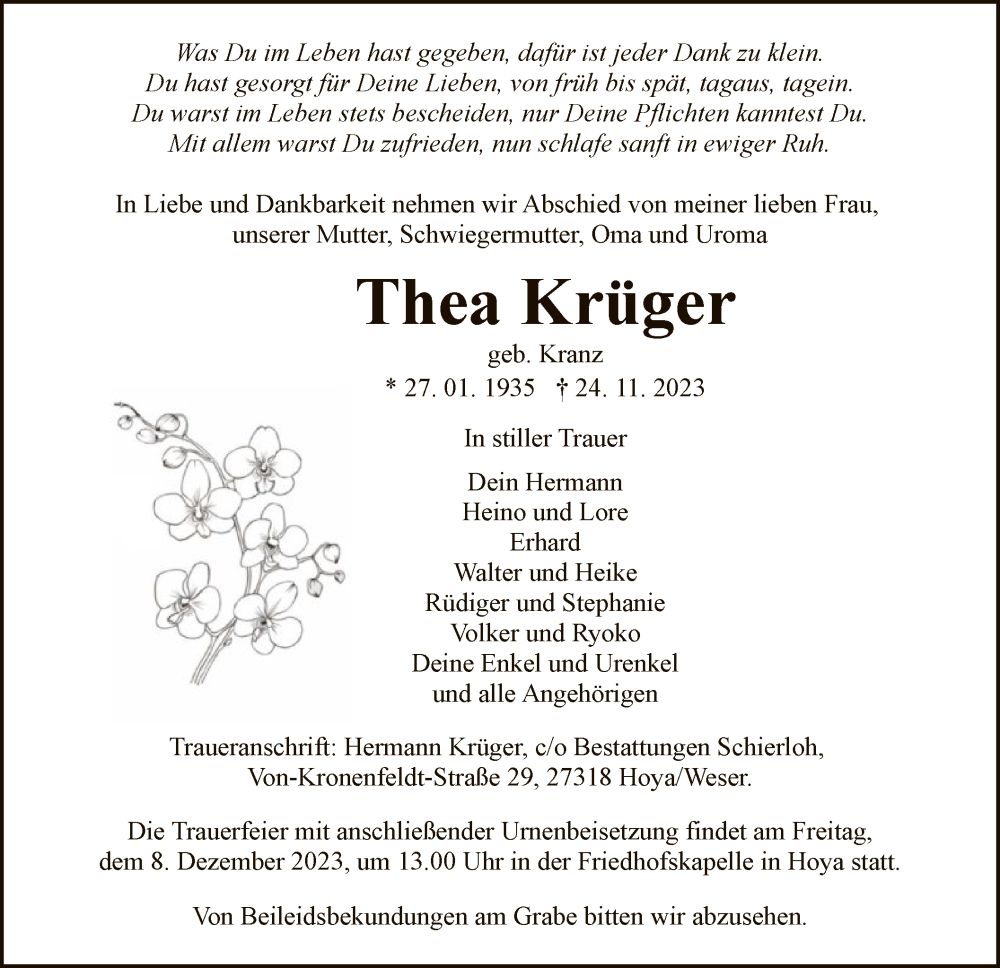 Hier finden Sie alle Traueranzeigen aus der Zeitung, die bisher für Thea Krüger erschienen sind. Weitere Traueranzeigen, die in der Zeitung erscheinen, werden hier ebenfalls aufgelistet