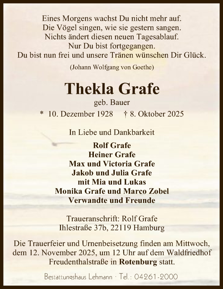 Hier finden Sie alle Traueranzeigen aus der Zeitung, die bisher für Thekla Grafe erschienen sind. Weitere Traueranzeigen, die in der Zeitung erscheinen, werden hier ebenfalls aufgelistet