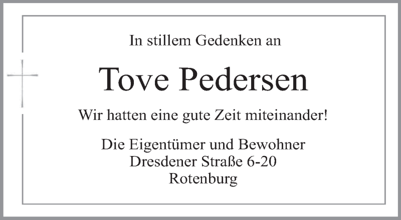 Hier finden Sie alle Traueranzeigen aus der Zeitung, die bisher für Tove Pedersen erschienen sind. Weitere Traueranzeigen, die in der Zeitung erscheinen, werden hier ebenfalls aufgelistet