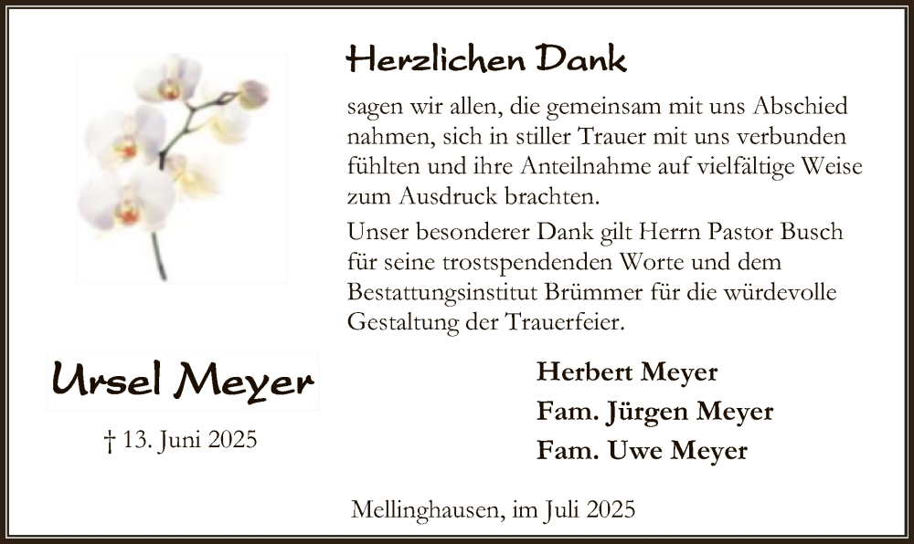 Hier finden Sie alle Traueranzeigen aus der Zeitung, die bisher für Ursel Meyer erschienen sind. Weitere Traueranzeigen, die in der Zeitung erscheinen, werden hier ebenfalls aufgelistet