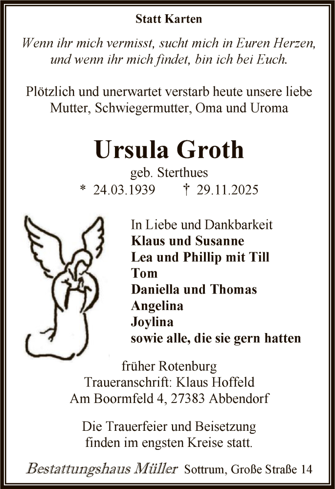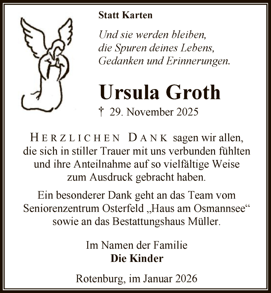 Hier finden Sie alle Traueranzeigen aus der Zeitung, die bisher für Ursula Groth erschienen sind. Weitere Traueranzeigen, die in der Zeitung erscheinen, werden hier ebenfalls aufgelistet