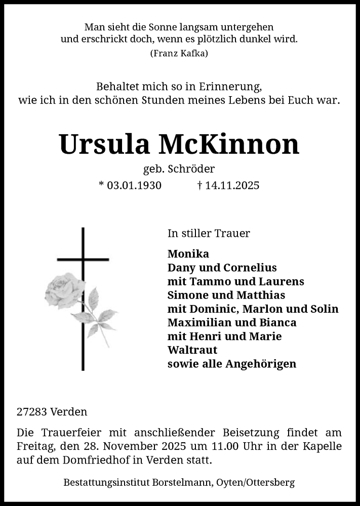 Hier finden Sie alle Traueranzeigen aus der Zeitung, die bisher für Ursula McKinnon erschienen sind. Weitere Traueranzeigen, die in der Zeitung erscheinen, werden hier ebenfalls aufgelistet