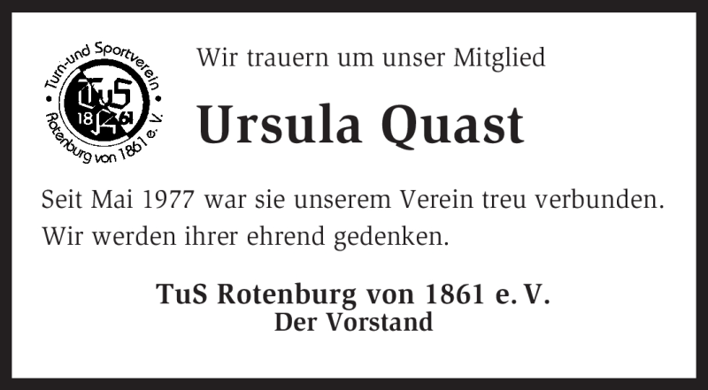 Hier finden Sie alle Traueranzeigen aus der Zeitung, die bisher für Ursula Quast erschienen sind. Weitere Traueranzeigen, die in der Zeitung erscheinen, werden hier ebenfalls aufgelistet