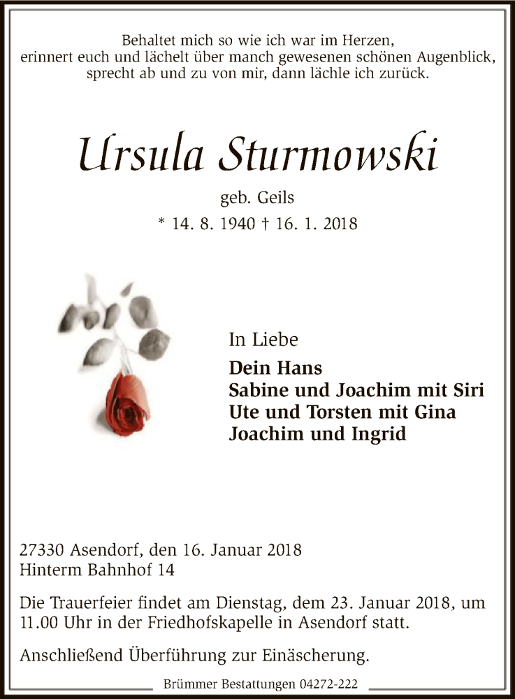 Hier finden Sie alle Traueranzeigen aus der Zeitung, die bisher für Ursula Sturmowski erschienen sind. Weitere Traueranzeigen, die in der Zeitung erscheinen, werden hier ebenfalls aufgelistet