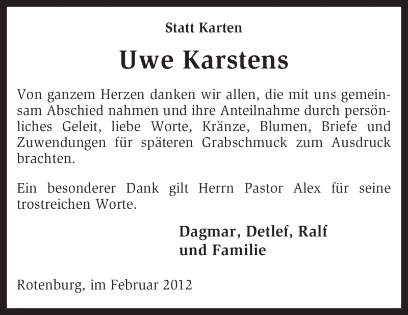 Hier finden Sie alle Traueranzeigen aus der Zeitung, die bisher für Uwe Karstens erschienen sind. Weitere Traueranzeigen, die in der Zeitung erscheinen, werden hier ebenfalls aufgelistet