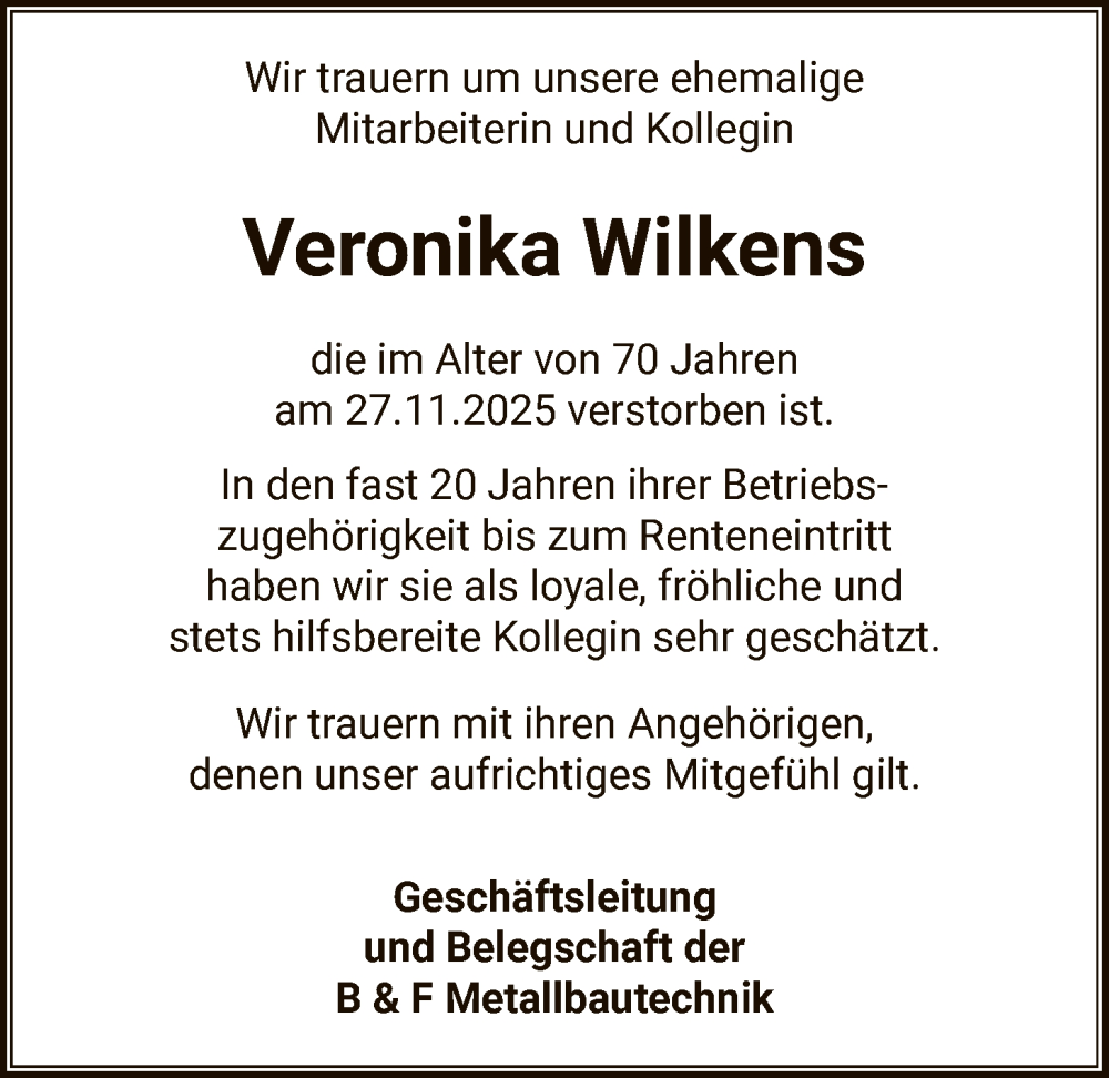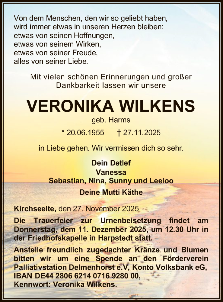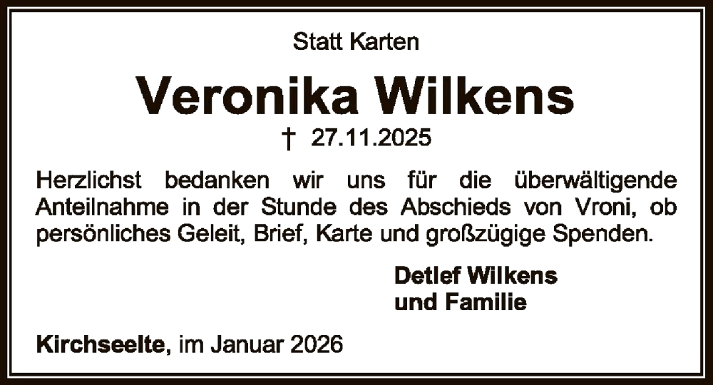 Hier finden Sie alle Traueranzeigen aus der Zeitung, die bisher für Veronika Wilkens erschienen sind. Weitere Traueranzeigen, die in der Zeitung erscheinen, werden hier ebenfalls aufgelistet