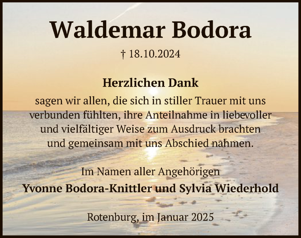 Hier finden Sie alle Traueranzeigen aus der Zeitung, die bisher für Waldemar Bodora erschienen sind. Weitere Traueranzeigen, die in der Zeitung erscheinen, werden hier ebenfalls aufgelistet