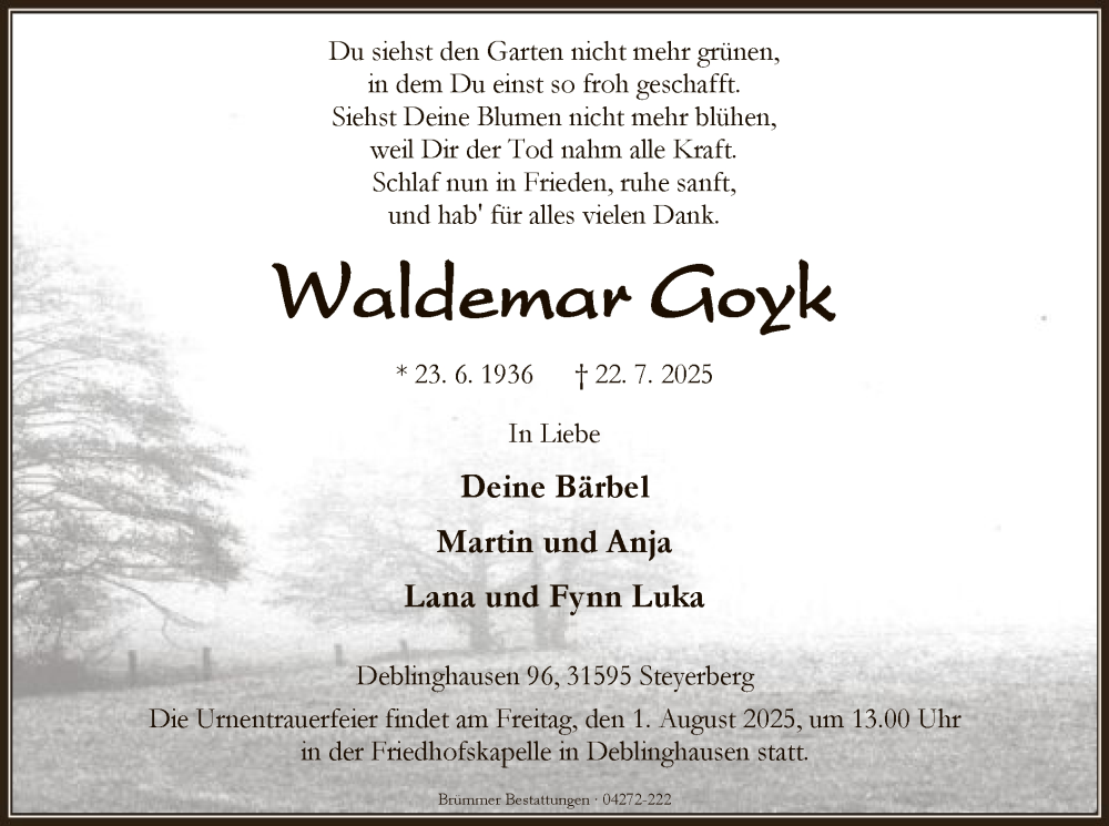 Hier finden Sie alle Traueranzeigen aus der Zeitung, die bisher für Waldemar Goyk erschienen sind. Weitere Traueranzeigen, die in der Zeitung erscheinen, werden hier ebenfalls aufgelistet
