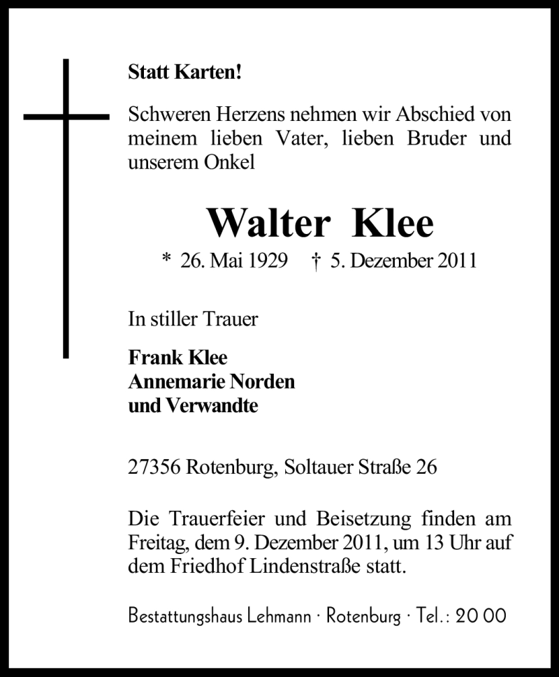 Hier finden Sie alle Traueranzeigen aus der Zeitung, die bisher für Walter Klee erschienen sind. Weitere Traueranzeigen, die in der Zeitung erscheinen, werden hier ebenfalls aufgelistet