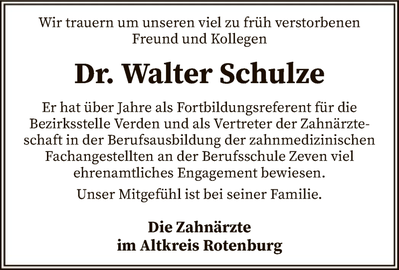 Hier finden Sie alle Traueranzeigen aus der Zeitung, die bisher für Walter Schulze erschienen sind. Weitere Traueranzeigen, die in der Zeitung erscheinen, werden hier ebenfalls aufgelistet