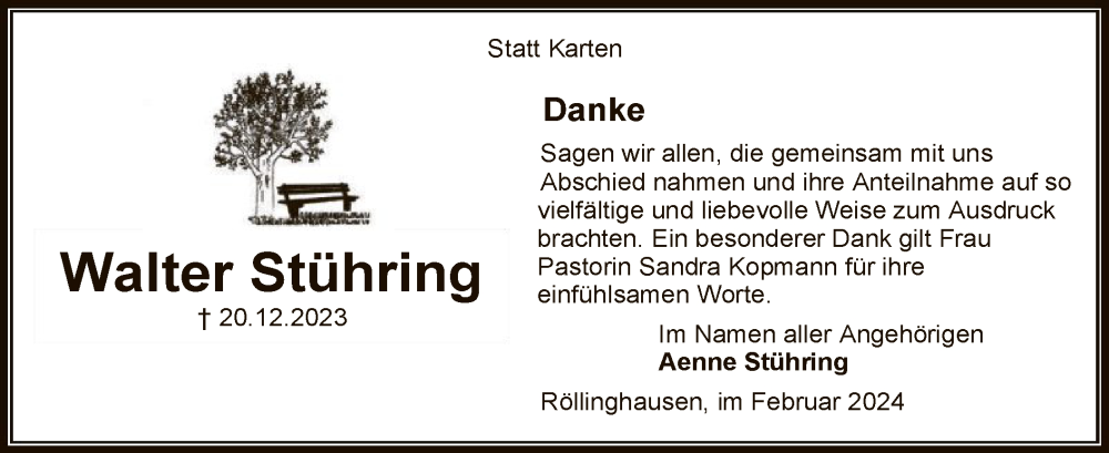 Hier finden Sie alle Traueranzeigen aus der Zeitung, die bisher für Walter Stühring erschienen sind. Weitere Traueranzeigen, die in der Zeitung erscheinen, werden hier ebenfalls aufgelistet