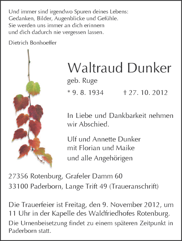Hier finden Sie alle Traueranzeigen aus der Zeitung, die bisher für Waltraud Dunker erschienen sind. Weitere Traueranzeigen, die in der Zeitung erscheinen, werden hier ebenfalls aufgelistet