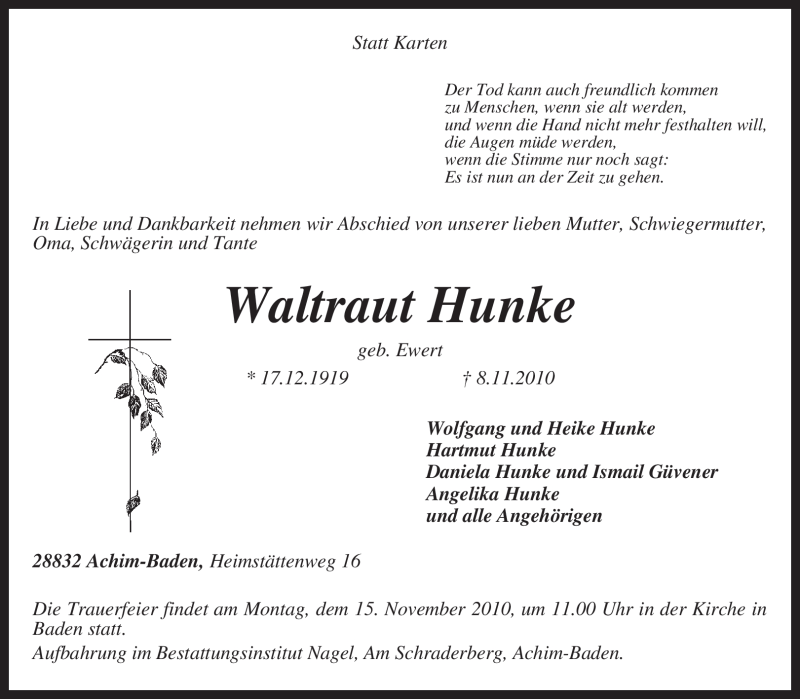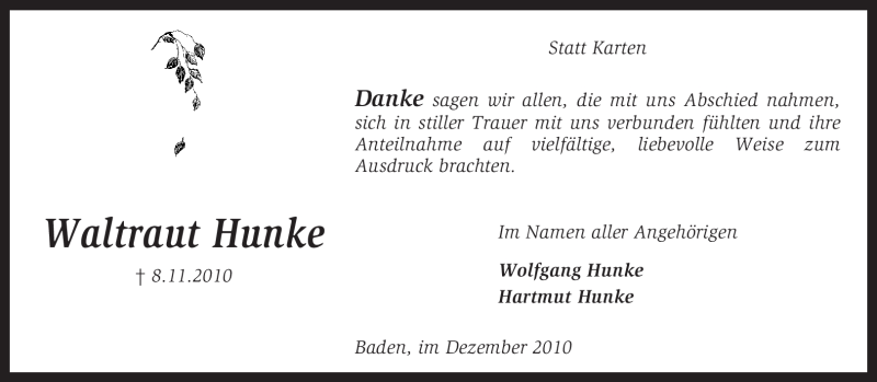 Hier finden Sie alle Traueranzeigen aus der Zeitung, die bisher für Waltraut Hunke erschienen sind. Weitere Traueranzeigen, die in der Zeitung erscheinen, werden hier ebenfalls aufgelistet