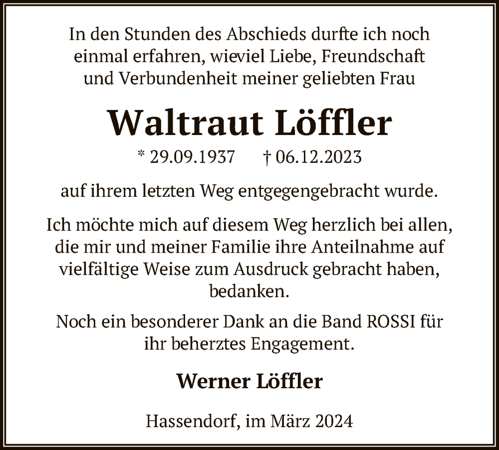 Hier finden Sie alle Traueranzeigen aus der Zeitung, die bisher für Waltraut Löffler erschienen sind. Weitere Traueranzeigen, die in der Zeitung erscheinen, werden hier ebenfalls aufgelistet