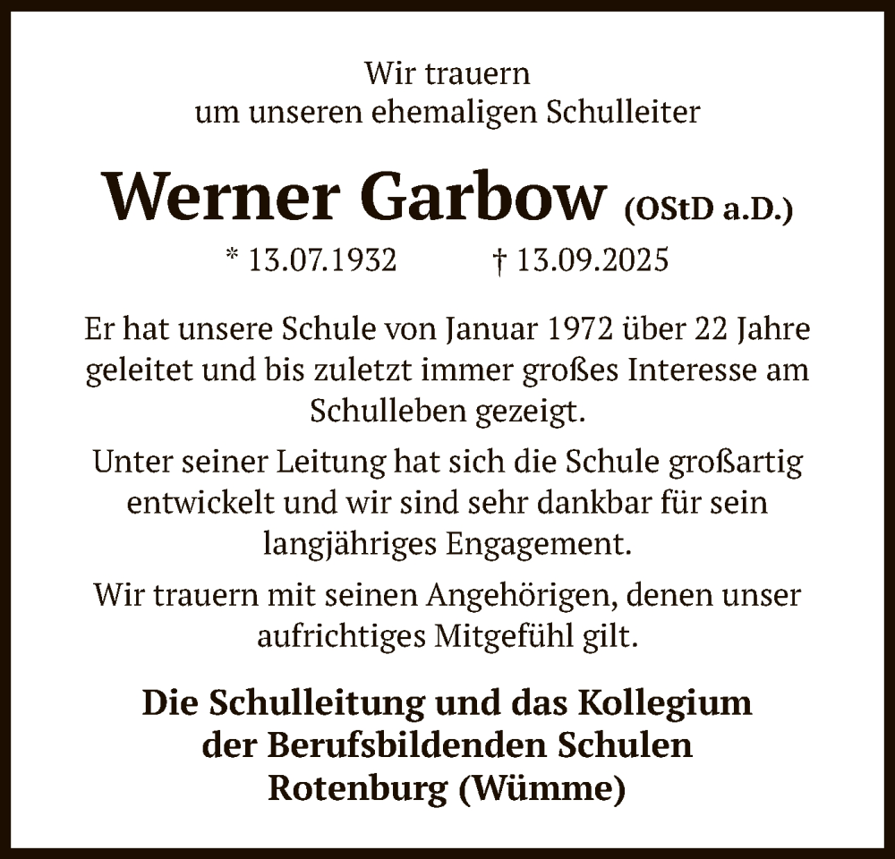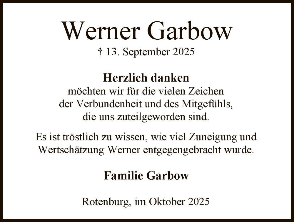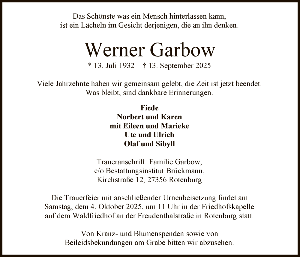 Hier finden Sie alle Traueranzeigen aus der Zeitung, die bisher für Werner Garbow erschienen sind. Weitere Traueranzeigen, die in der Zeitung erscheinen, werden hier ebenfalls aufgelistet