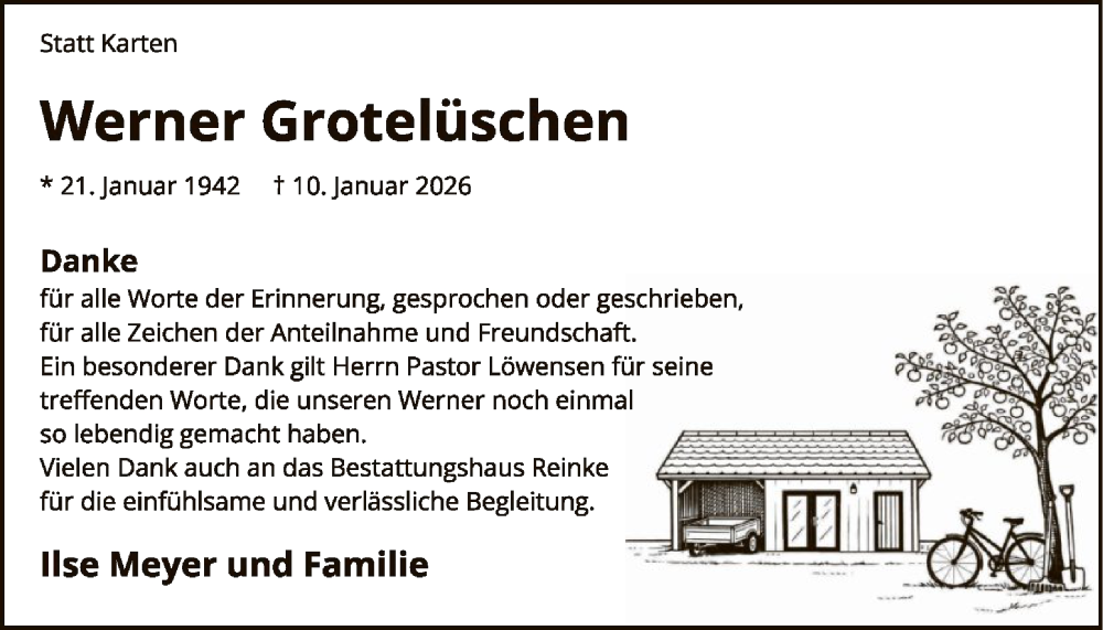 Hier finden Sie alle Traueranzeigen aus der Zeitung, die bisher für Werner Grotelüschen erschienen sind. Weitere Traueranzeigen, die in der Zeitung erscheinen, werden hier ebenfalls aufgelistet