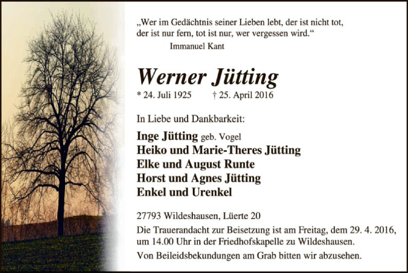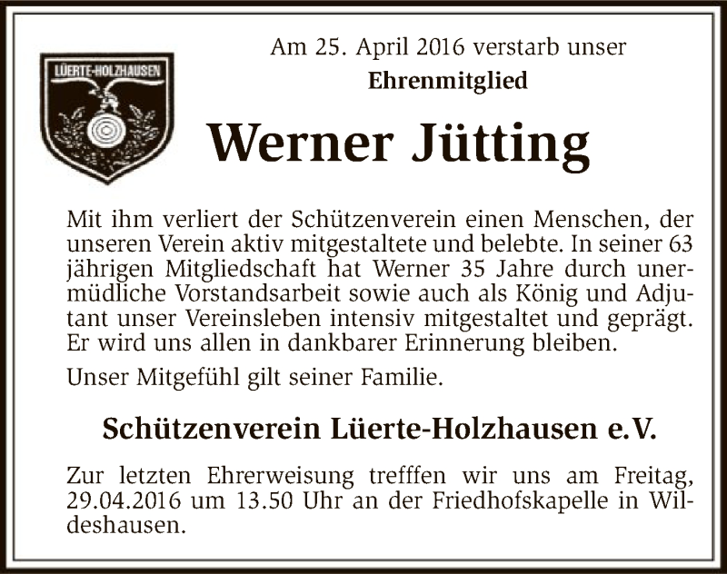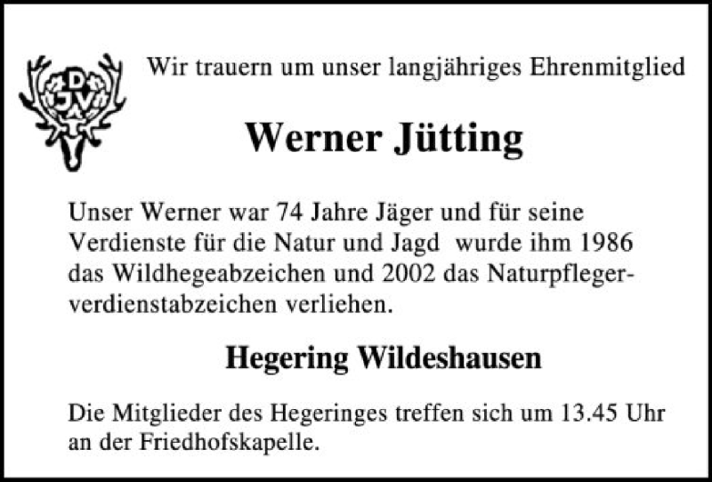 Hier finden Sie alle Traueranzeigen aus der Zeitung, die bisher für Werner Jütting erschienen sind. Weitere Traueranzeigen, die in der Zeitung erscheinen, werden hier ebenfalls aufgelistet