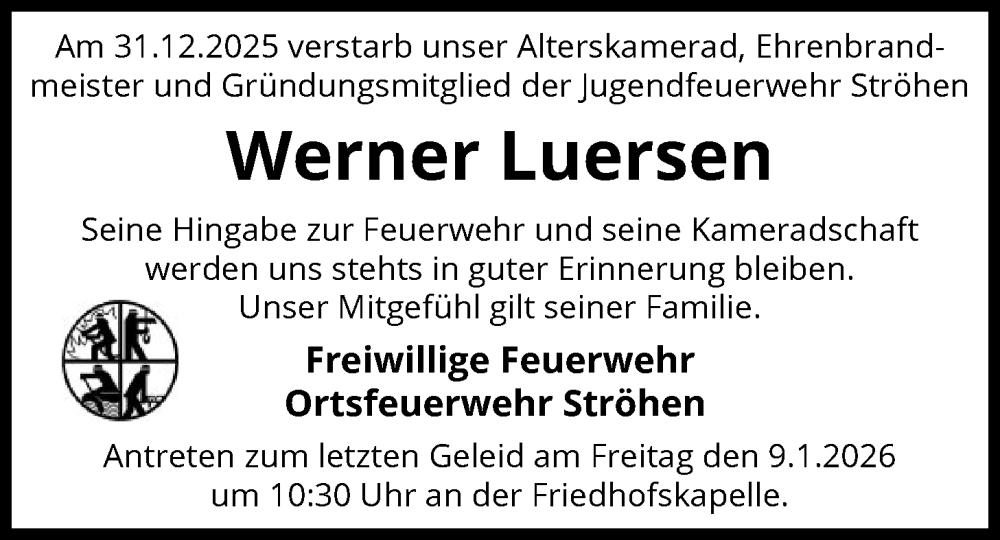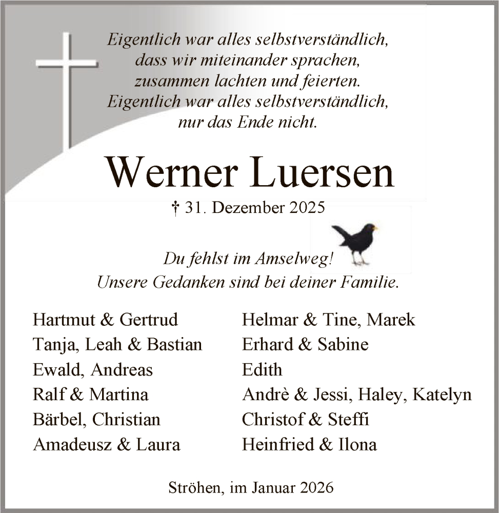 Hier finden Sie alle Traueranzeigen aus der Zeitung, die bisher für Werner Luersen erschienen sind. Weitere Traueranzeigen, die in der Zeitung erscheinen, werden hier ebenfalls aufgelistet