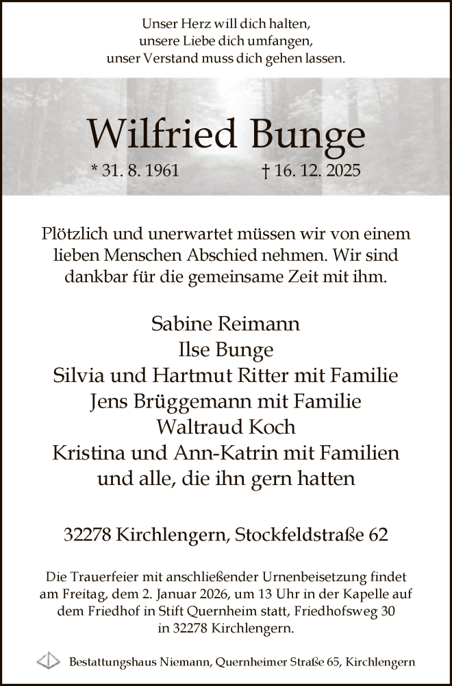 Hier finden Sie alle Traueranzeigen aus der Zeitung, die bisher für Wilfried Bunge erschienen sind. Weitere Traueranzeigen, die in der Zeitung erscheinen, werden hier ebenfalls aufgelistet