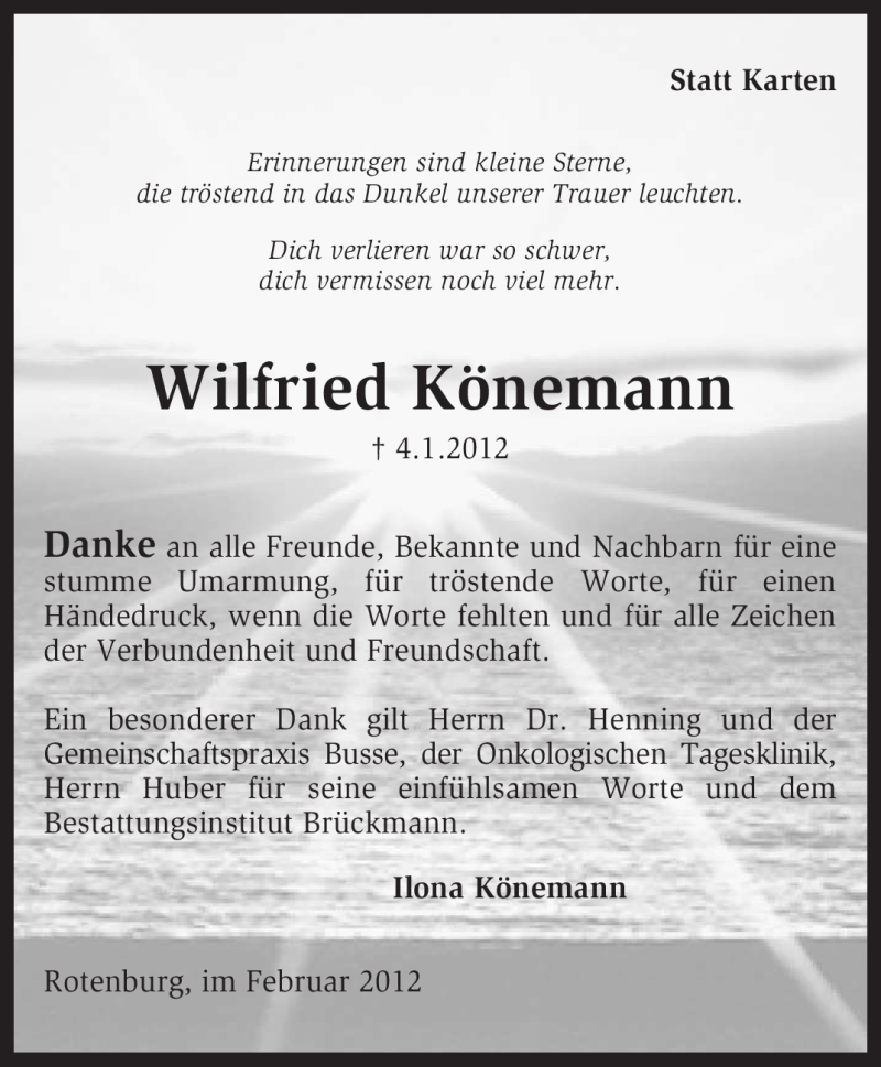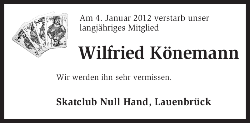 Hier finden Sie alle Traueranzeigen aus der Zeitung, die bisher für Wilfried Könemann erschienen sind. Weitere Traueranzeigen, die in der Zeitung erscheinen, werden hier ebenfalls aufgelistet