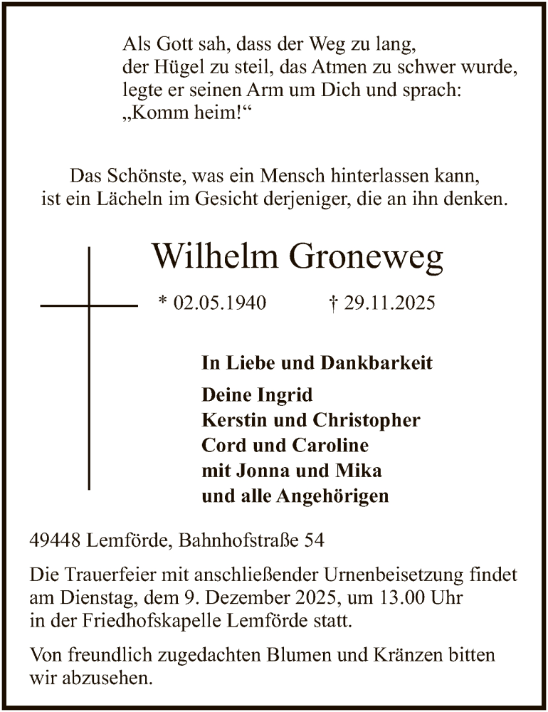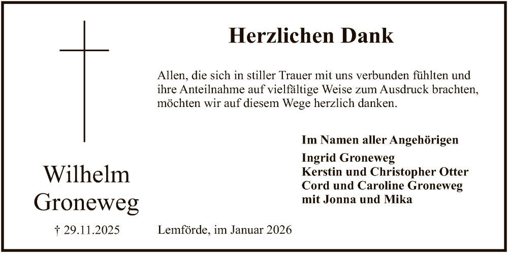 Hier finden Sie alle Traueranzeigen aus der Zeitung, die bisher für Wilhelm Groneweg erschienen sind. Weitere Traueranzeigen, die in der Zeitung erscheinen, werden hier ebenfalls aufgelistet