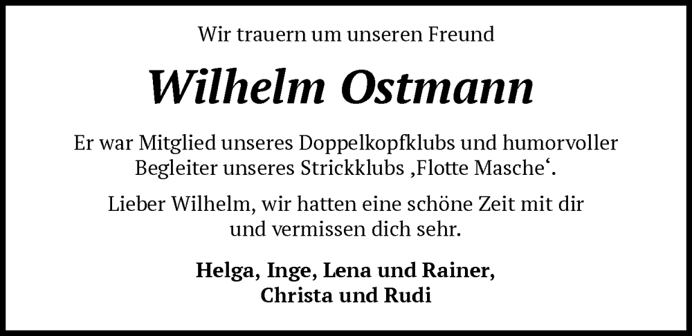 Hier finden Sie alle Traueranzeigen aus der Zeitung, die bisher für Wilhelm Ostmann erschienen sind. Weitere Traueranzeigen, die in der Zeitung erscheinen, werden hier ebenfalls aufgelistet